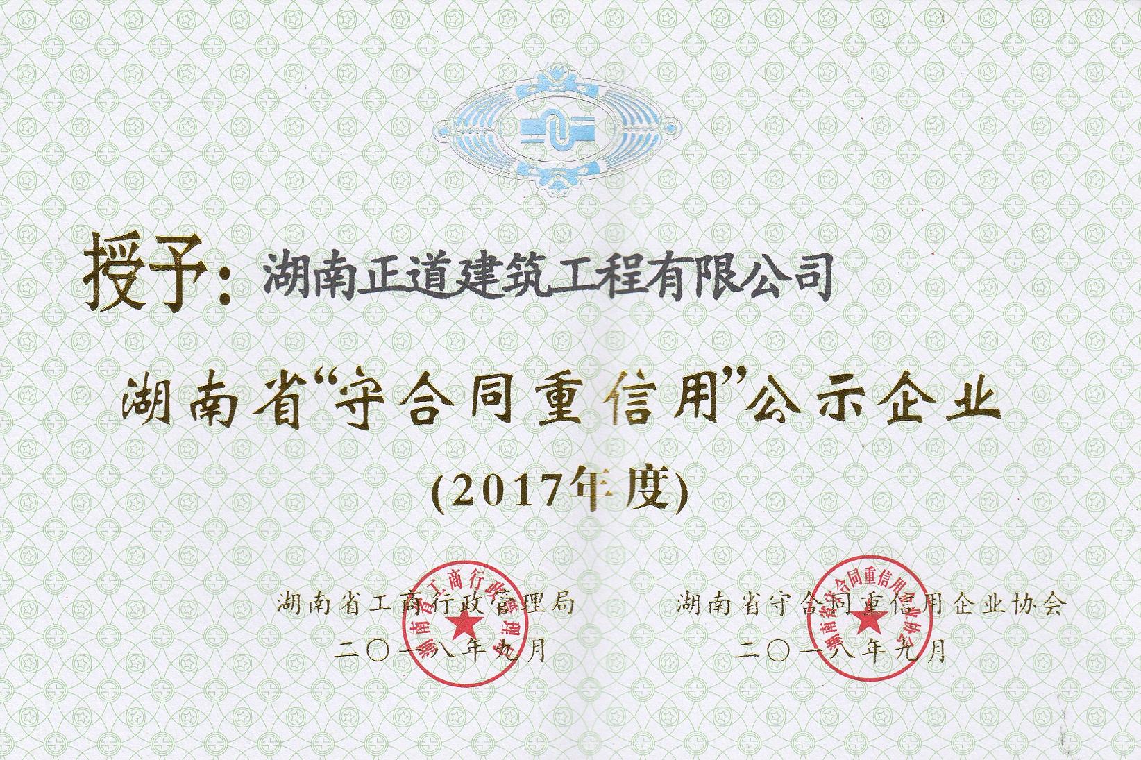 2018年9月湖南省工商行政管理局授予我公司2017年度湖南省“守合同重信用”单位称号