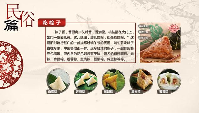 端午节为每年农历五月初五,又称端阳节、午日节、五月节等;端午节是中国汉族人民纪念屈原的传统节日,更有吃粽子,赛龙舟,挂菖蒲、蒿草、艾叶,薰苍术、白芷,喝雄黄酒的习俗。“端午节”为国家法定节假日之一,并被列入世界非物质文化遗产名录。