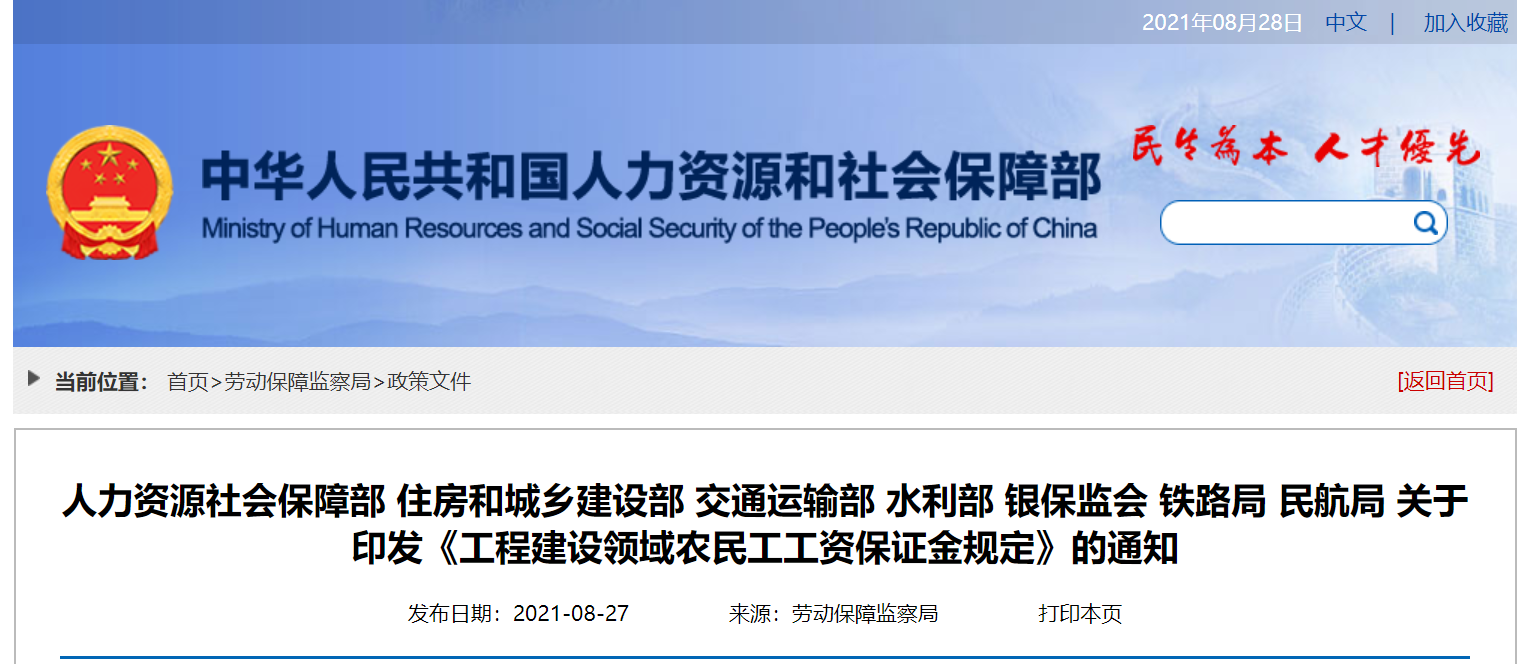 8月27日,人力资源社会保障部 住房和城乡建设部 交通运输部 水利部 银保监会 铁路局 民航局印发《工程建设领域农民工工资保证金规定》,原文通知如下: