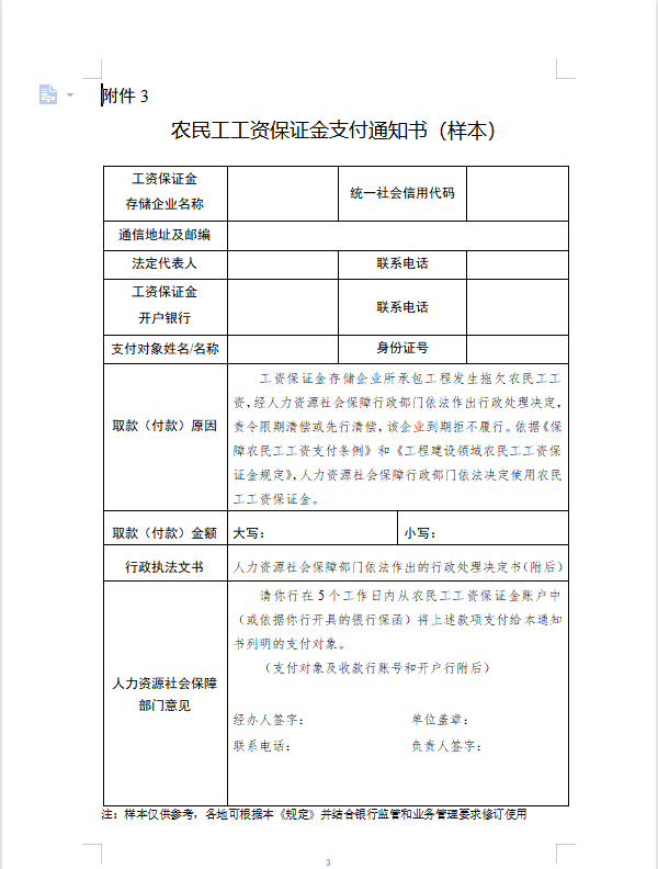 3.农民工工资保证金支付通知书(样本)