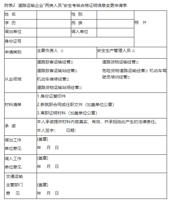 附表2 道路运输企业“两类人员”安全考核合格证明信息变更申请表