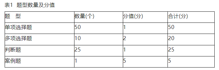 1.试题类型包括:单项选择题、多项选择题、判断题和案例题,全部为客观题。题型数量及分值见表1。