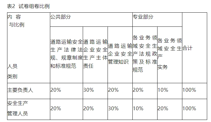 3.“两类人员”参加考核时,应根据企业经营范围及岗位职责选择相应业务领域。道路运输企业经营2个及以上业务领域的,其“两类人员”可同场次加试或根据属地考核主管部门安排另外场次加试相应业务领域的专业试题。主要负责人和安全生产管理人员业务领域发生变化的,应按规定加试相关领域的专业试题。考核合格的,同时取得相应业务领域的安全考核合格证明。每加试一个业务领域模块,考试时间增加30分钟。加试模块的题型数量及分值见表3。