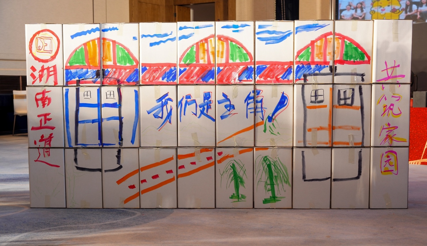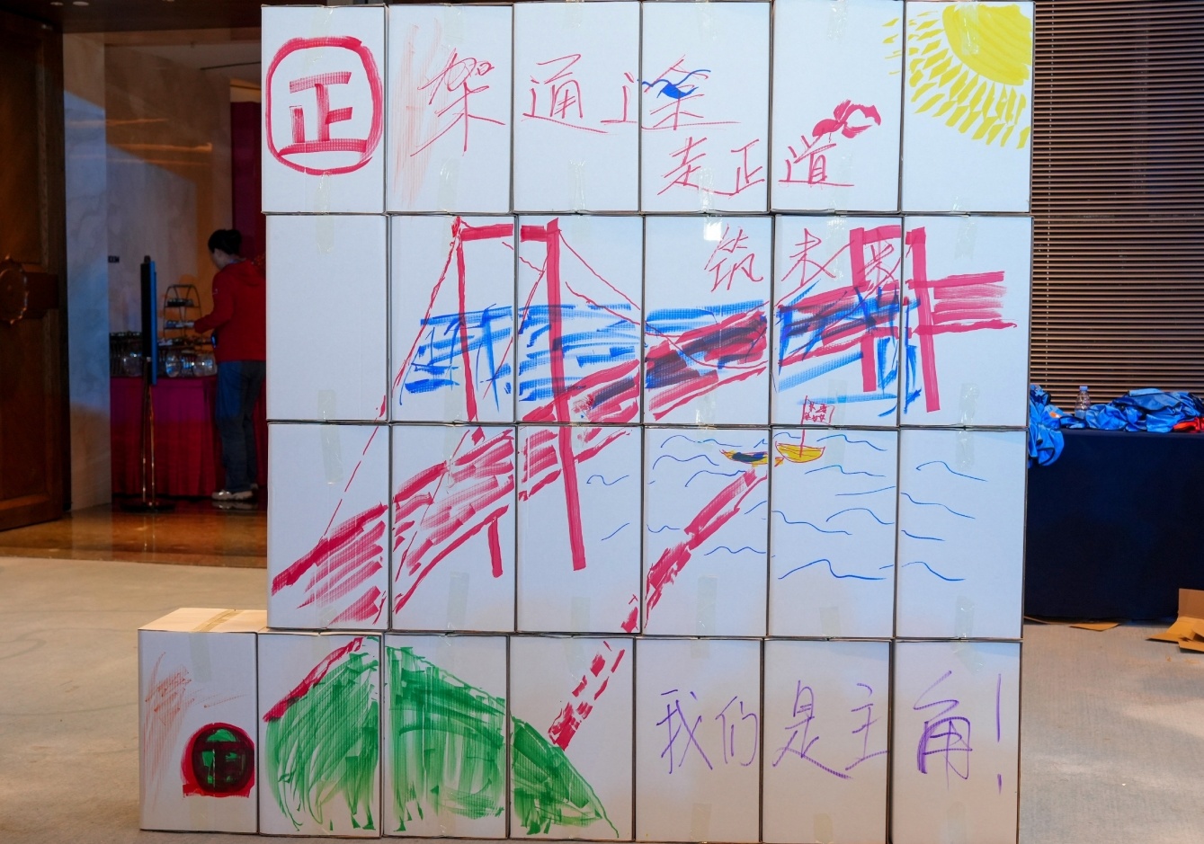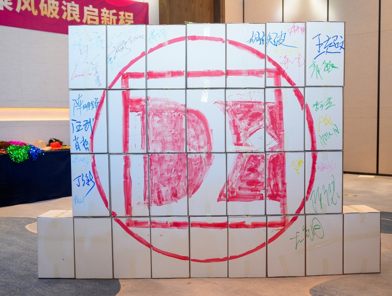 演出完毕,大家高举手中的箱鼓,层层叠垒,共同拼筑“正心行道,筑梦天下”企业文化墙。